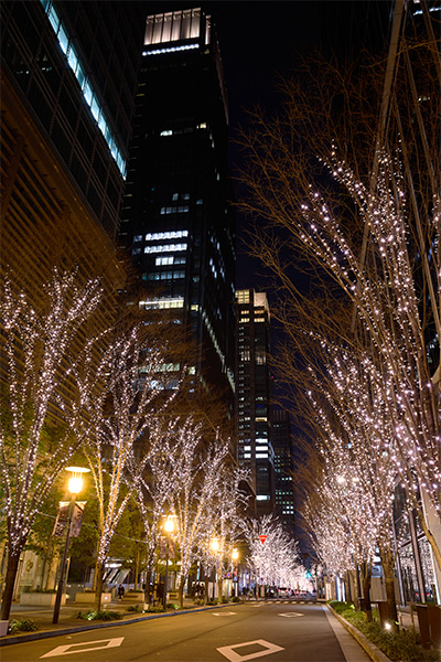 도쿄역 부근의 마루노우치 나카도리에서는 약 286개의 가로수가 82만 개의 골드빛 LED로 장식됩니다.