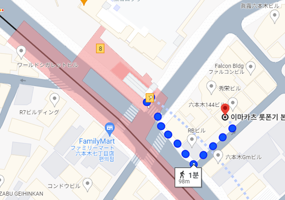 롯폰기역 7번 출구에서 도보로 약 1분 이내 걸리는 곳에 위치하고 있어 접근성이 매우 좋은 곳입니다.