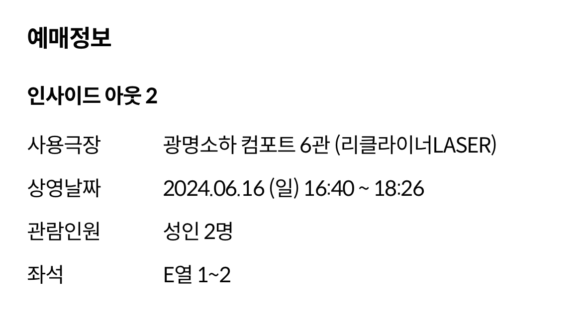 - 상영관: 컴포트 6관(리클라이너 LASER)