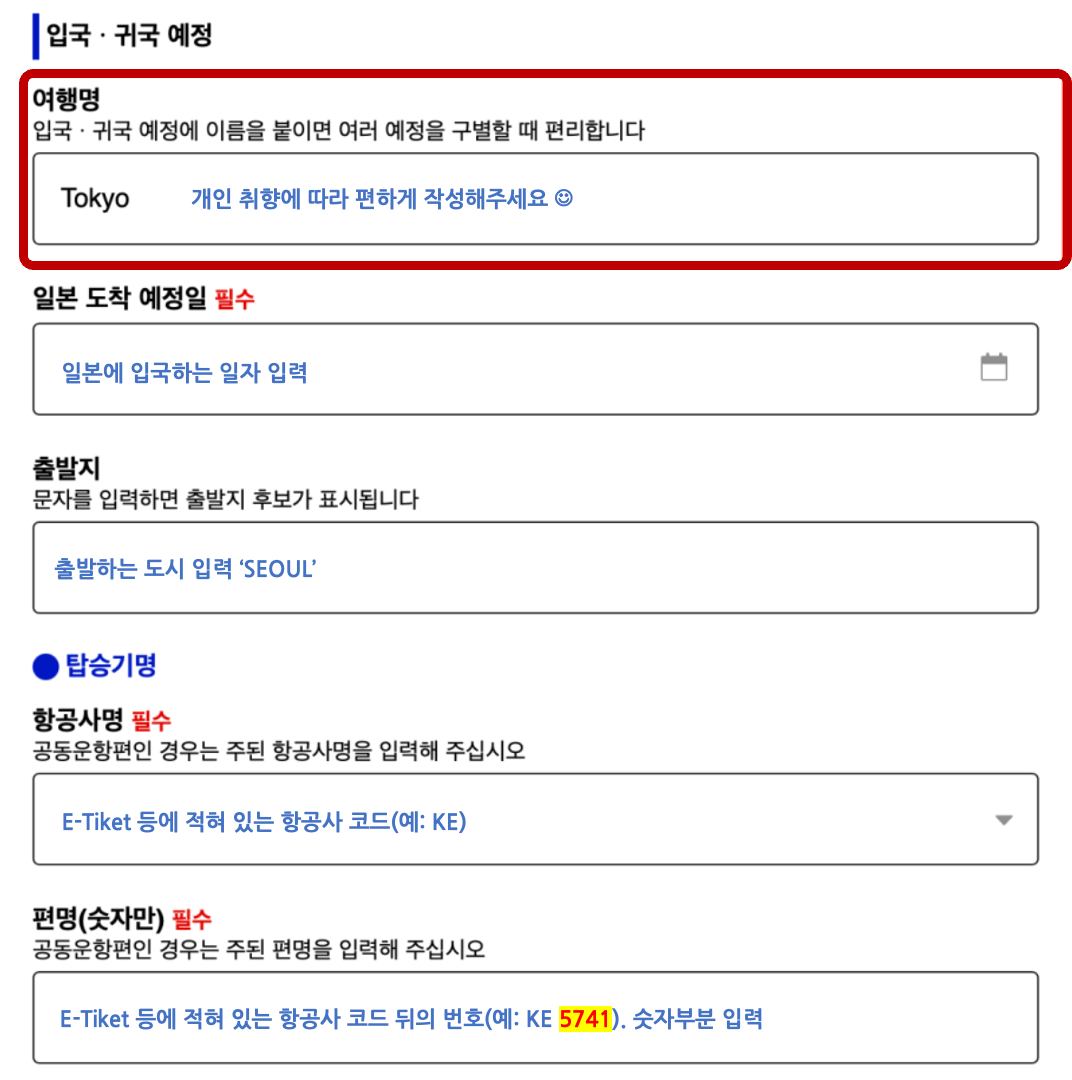 - 목적은 '관광', 일수는 여행일 수로 입력해 주세요.(5박 6일이면 '6'으로 입력)