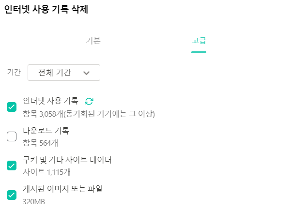 ㄴ 전체 기간의 쿠키 및 기타 사이트 데이터와 캐시 된 이미지 및 파일을 모두 삭제해 주세요