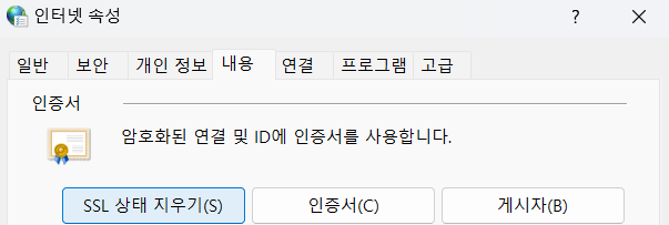 ※접속방법: 윈도 검색창 > '인터넷 옵션' 검색 > 내용 탭으로 이동 후 SSL 상태 지우기 클릭