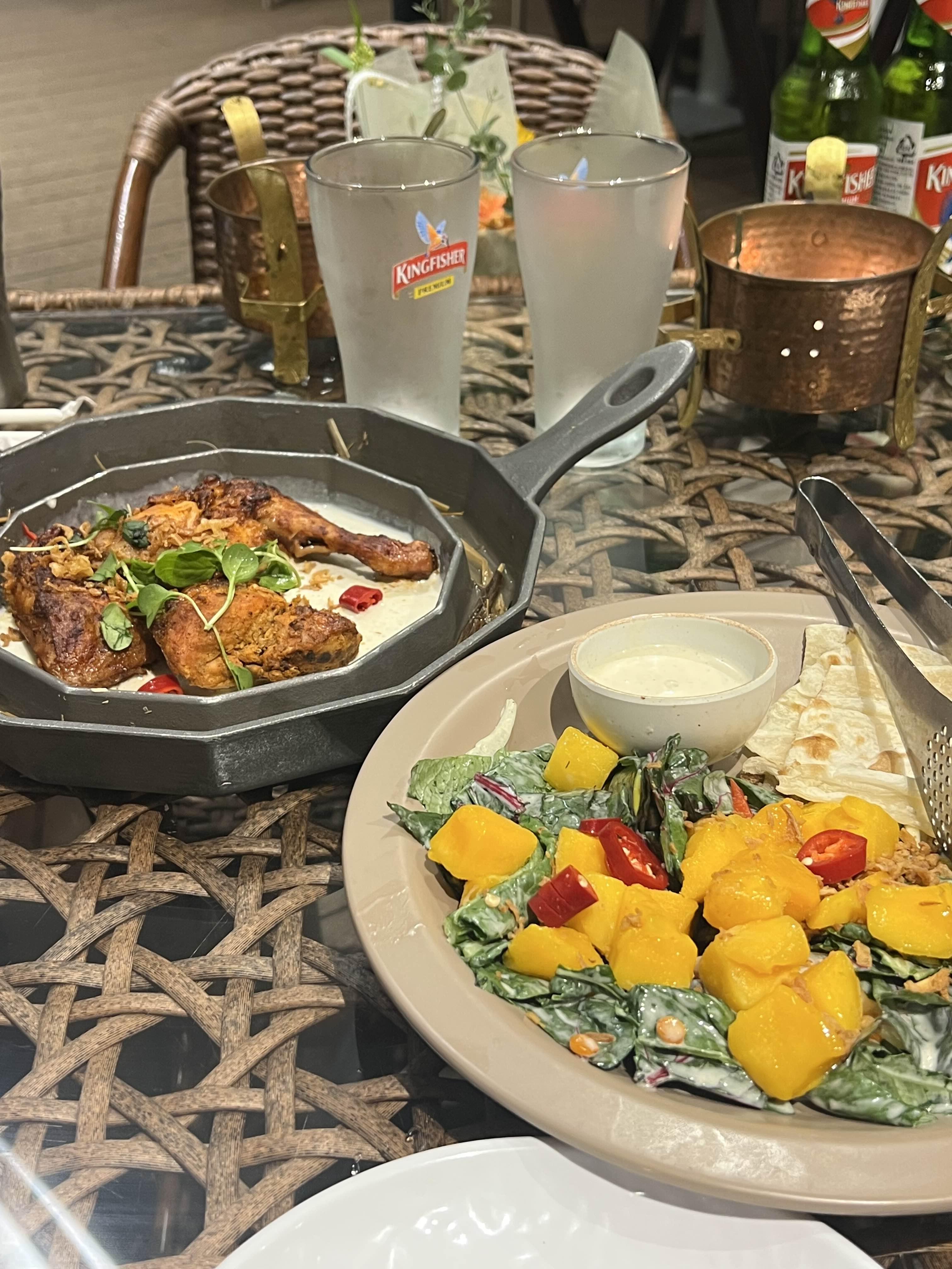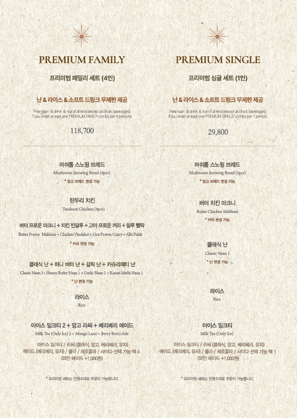 계절마다 달라지긴 하지만 에피타이저 형태의 브레드, 탄두리 치킨, 커리 + 난 등의 메뉴가 나옵니다.