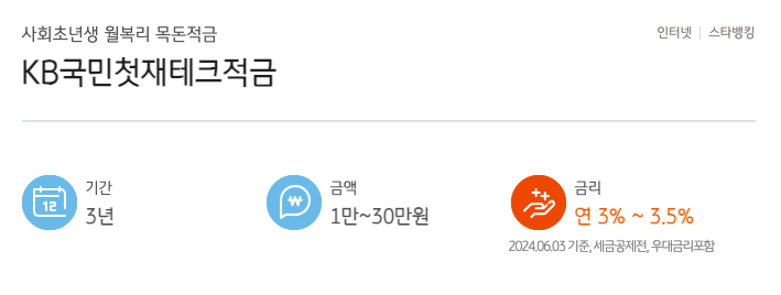 국민은행의 'KB국민 첫 재테크 적금'은 만 18세 ~ 38세 이하의 청년을 위한 상품으로,