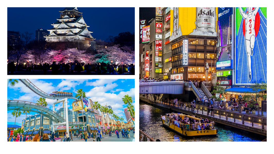 - 볼거리: 오사카성, 유니버설 스튜디오 재팬, 도톤보리 등