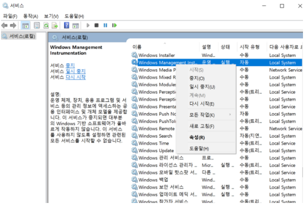 - `Windows Management Instrumentation` 서비스를 찾습니다.