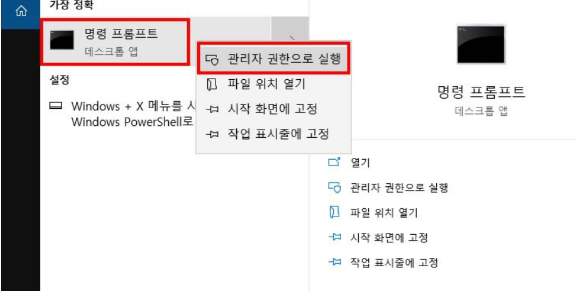 - 명령 프롬프트를 관리자 권한으로 실행합니다. (3번 참고)