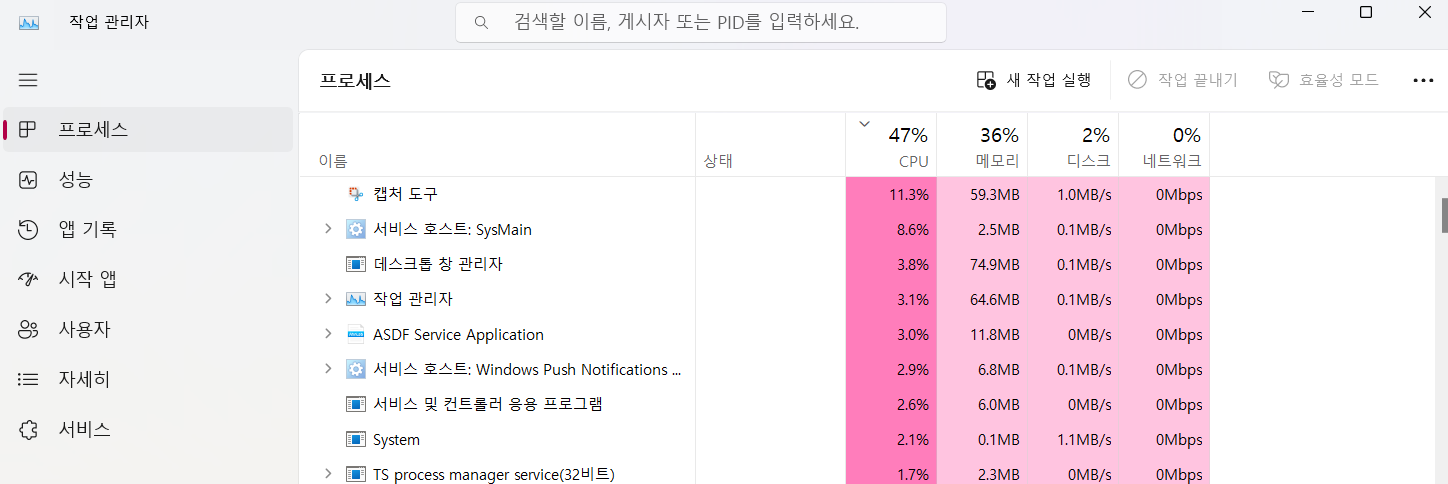 - 작업관리자를 열어 현재 CPU 점유율을 확인해봅니다.